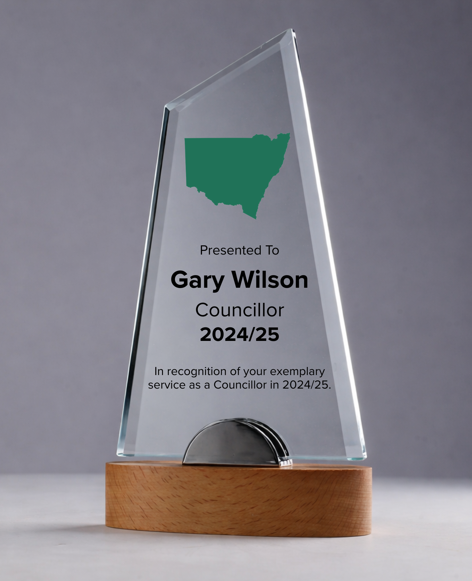 All councillors that have completed the first year of the current term are welcome to order an award. Display it with pride… on your desk… on the bookshelf at home… or maybe send it straight to the pool room. Local Government Councillors put in so much – it’s time to get some physical recognition of your stellar service.